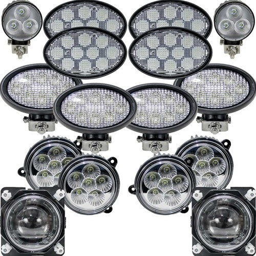 - Includes 16 lights (2 lower hood, 4 upper hood, 2 outer upper cab, and 8 cab or side work lights), connectors, mounting brackets, and hardware