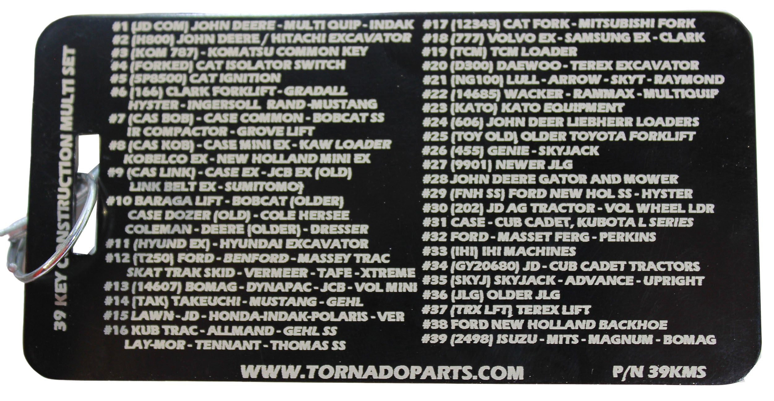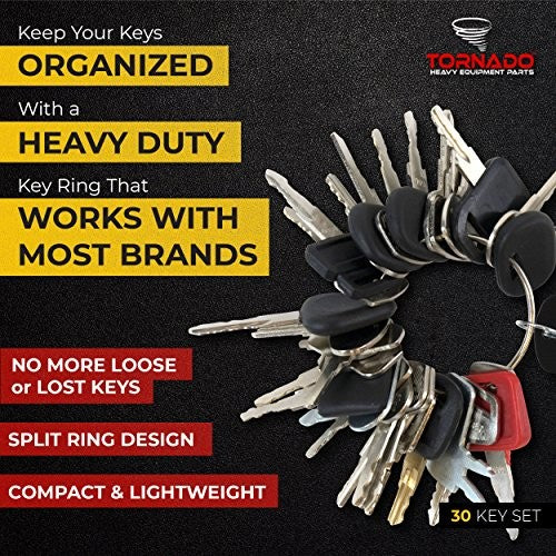 When You're In The Middle Of A Big Construction Project, Either Private Or Professional, The Last Thing You Need To Worry About Is Hunting Down Keys To Your Heavy Equipment. The Tornado Heavy Equipment Parts 39 Key Multi Set Is A Convenient Key Ring With 39 Master Keys For All Your Construction Equipment Needs, Giving You The Best Value For Your Money. This Heavy-Duty Key Ring Set Is Compact And Lightweight, Weighing About 1 Lb. This Makes It A Great Solution For Key Storage And Transportation. This Key Ring Helps To Keep Your Keys Organized And Easily Accessible. Rather Than Store Your Equipment Keys In A Heavy Case Or Disorganized Bag, The Tornado Heavy Equipment Parts 39 Key Multi Set Allows You To Keep All Your Keys In One Handy, Easily Accessible Place Saving You Time And Eliminating The Hassle Of Loose Or Lost Keys. Although This Key Ring Is Designed For Maximum Durability On Tough Jobs, It Is Also Made To Accommodate Use By Men, Women, Or Even Kids. The Ring For This Key Set Is Constructed With A Split Ring Design, So You Can Add Or Remove Keys As Needed. This Set Does Not Include Duplicate Keys, Giving You The Best Coverage For A Wide Range Of Equipment At The Lowest Price Possible. The Tornado Heavy Equipment Parts 39 Key Multi Set Works With Most Brands And Tools. This Set Can Be Used With Backhoes And Other Equipment From CAT, John Deere, Kubota, Komatsu, John Clark, And Many More Brands.